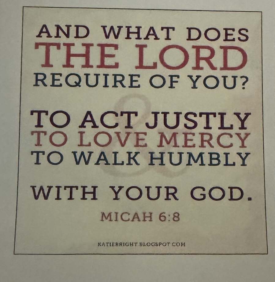 Micah 6:8 He has showed you, O man, what is good. And what does the LORD require of you? To act justly and to love mercy and to walk humbly with your God.