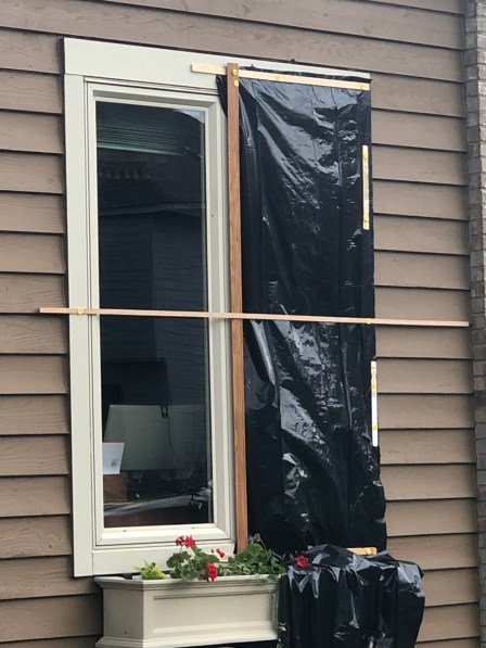 I began closing our four open windows. As I tried to turn the crank to close the front window in the den, I realized there was no window! It was laying shattered on the ground as wind and rain blew into our house. I ran to the neighbors, who helped me install a temporary plastic to protect our interior.